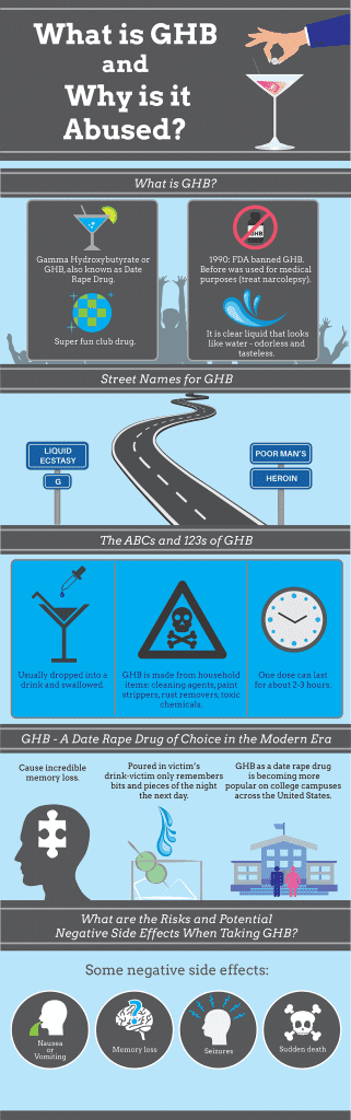 GHB can be a date rape drug. The drug is often used to spike drinks because it is odorless, colorless, and tasteless. These characteristics make it easy to slip into someone’s drink without knowing.
